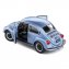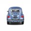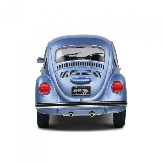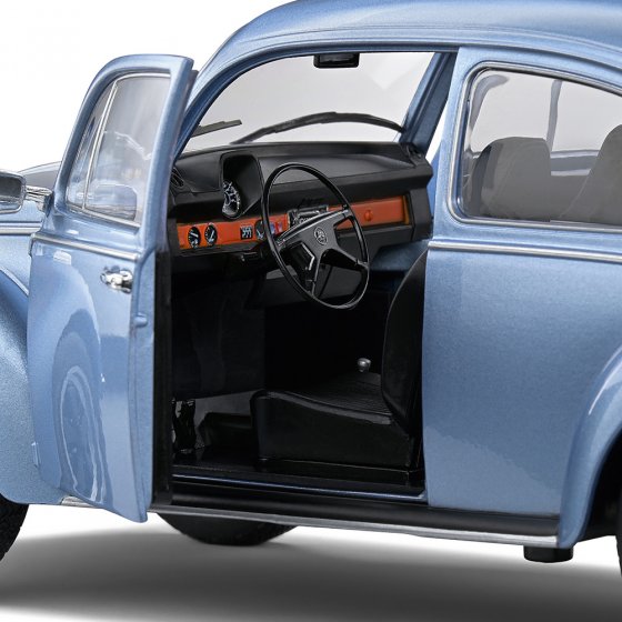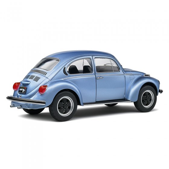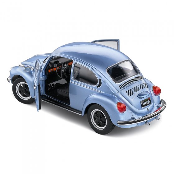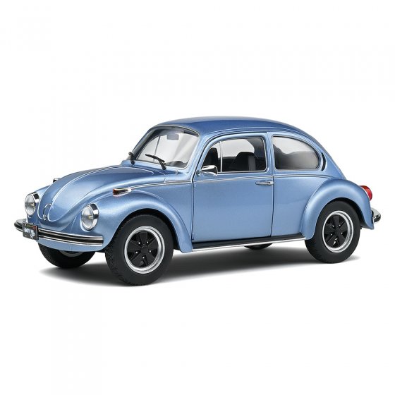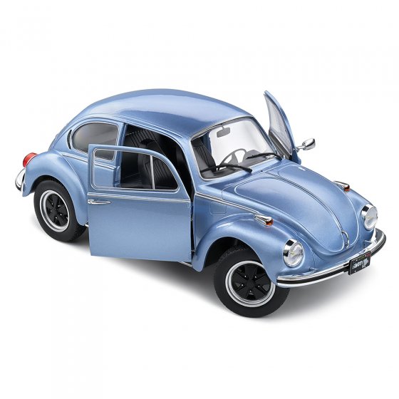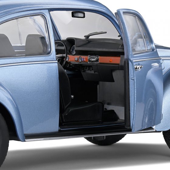 De VW Kever, ontwikkeld in de jaren 30 van de vorige eeuw, is de op één na meest gebouwde auto ter wereld. In het jaar 2002 werd hij weliswaar door de VW Golf ingehaald, maar terwijl de Golf verschillende ontwikkelingen doormaakte, bleef de Kever meer dan 65 jaar aan de buitenkant vrijwel hetzelfde. Alleen onder de kap werden er telkens verbeteringen doorgevoerd. Het 1:18-model VW KEVER 1303 S toont de sportieve jaren 70-versie met 1584 cm3 en 50 pk. Zijn metallic ijsblauwe lak maakt van hem een blikvanger in elke collectie. De voorwielen zijn bestuurbaar, de deuren kunnen open. Afmetingen (l x b x h): ca. 22 x 9 x 9 cm. Haak deze evergreen in huis!