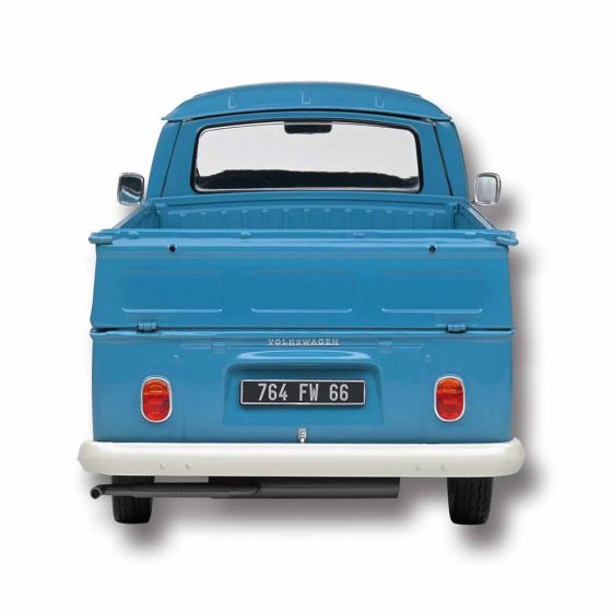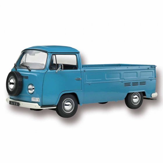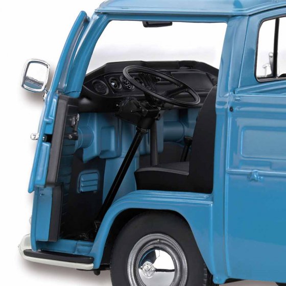 De tweede generatie van de VW Transporter consolideerde zijn reputatie als een van de meest veelzijdige bedrijfsvoertuigen van zijn tijd: onder meer de ‘Bulli’ (eigenlijk ‘BuLi’, bestaande uit ‘Bus’ (bus) en ‘Lieferwagen’ (bestelwagen)) was verkrijgbaar. als gesloten bestelwagen, als camper en als dubbele cabine. Het schaalmodel VW T2 PRITSCHE (1:18) toont hem met een open laadruimte, die in het origineel een oppervlakte had van maar liefst 4,3 m2. Alle details, zoals het VW-logo, de ronde koplampen en de modeltypische ventilatiesleuven onder de voorruit, zijn fijn uitgewerkt; de portieren en de laadklep kunnen geopend worden. Afmetingen (l x b x h): ca. 24 x 10 x 10 cm. Koop dit wereldberoemde ‘alles-in-één gereedschap’ voor de auto-industrie!