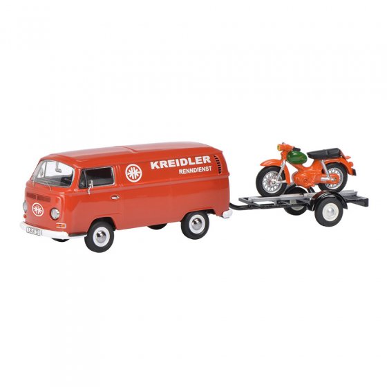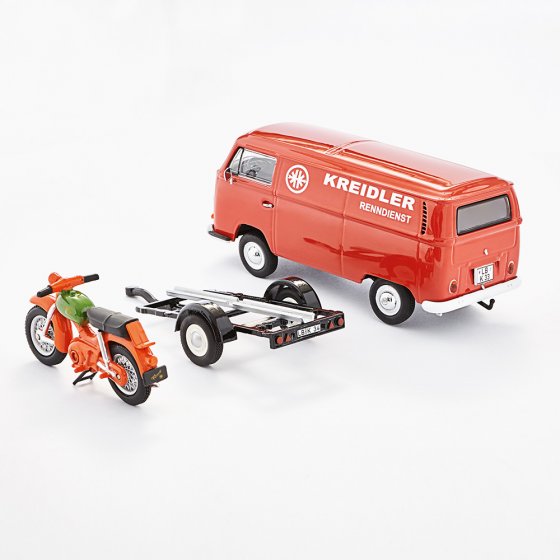 De in totaal meer dan 6 decennia durende zegetocht van de VW Transporter – ook 'Bulli' genoemd – leverde 5 modelseries op. Een van de succesvolste was de T2: zijn aantallen overtroffen zowel de productie van de voorganger T1 als de productie van de opvolger T3 ruimschoots. Dit model VW T2A 'KREIDLER' toont de T2 als bestelwagen met aanhanger. Op de aanhanger staat een Kreidler Florett, de bromfiets die in de jaren 60 als van een van de meest geliefde gemotoriseerde tweewielers bekend stond. Model van zinkdrukgietwerk met foto-etsdelen en aanbouwelementen van kunststof. Schaal: 1:43. Afmetingen (l x b x h): ca. 24 x 6 x 6 cm. Mooi model om in de collectie te hebben.