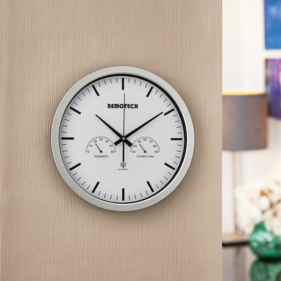 Het is geen geheim dat de kamertemperatuur en de luchtvochtigheid een aanzienlijke invloed hebben op het algemeen welzijn. Deze WANDKLOK 'THERMO/HYGRO' laat u altijd op twee schalen zien of de ruimte op de ideale temperatuur is en hoe droog de lucht op dat moment is. Ook de actuele tijd is tot op de seconde nauwkeurig af te lezen, aangestuurd door de tijdsignaalzender DCF77. De zilverkleurige kast van de klok past bij elk interieur en elke muurkleur. Afmetingen: Ø ca. 35 cm, dikte kast ca. 4 mm. Werkt op een AA-batterij (apart verkrijgbaar). Reageert u gevoelig als het binnenklimaat niet goed is? Kijk vaker op de klok, dan kunt u hem goed in de gaten houden!