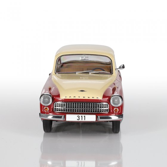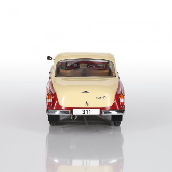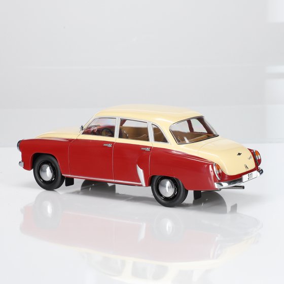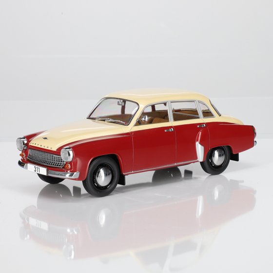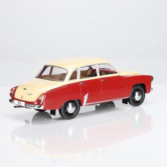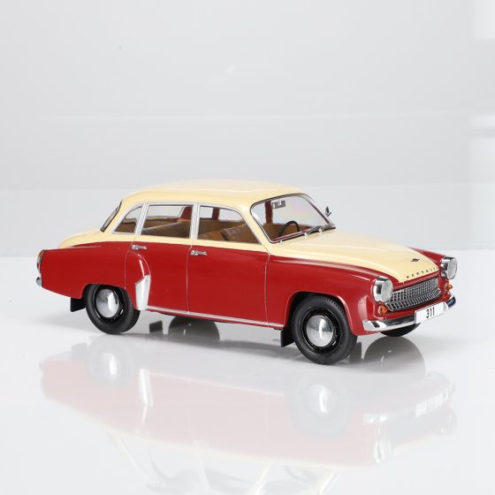 De toutes les voitures de l'ancienne RDA, la Wartburg 311 était celle qui jouissait de la plus grande reconnaissance internationale – car c'était une bonne voiture, même selon les critères occidentaux. Par conséquent, les chiffres de vente à l'étranger étaient assez élevés. Même si le moteur de 3 cylindres de la 311 n'avait que 37 cv (puis 40 cv à partir de 1961), la carrosserie de limousine était très appréciée pour son esthétique. De plus, la construction sur châssis en échelle permettait de nombreuses variantes, telles que coupé, cabriolet et break. Ce modèle 1:18 de la WARTBURG 311 dans sa version de 1959 séduit avant tout par l'exactitude de ses détails et sa peinture bicolore. Dimensions (L x l x H) : env. 24 x 9 x 8 cm. Complétez votre collection avec une des meilleures voitures jamais construites à Eisenach !