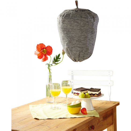 “Hoe smaakte de vruchtentaart?” – “Weet ik niet! Moet je de wespen vragen!“ Kent u zulke gesprekken? Hoe nuttig die dwarsgestreepte “gevechtspiloten” in de natuur ook mogen zijn: Als tafelgast bij de mens is ze ongewenst. Met de WESPENVERDRIJVER zorgt u ervoor, dat een openlucht kof ekransje in uw tuin of op het balkon wespenvrij blijft. En zo functioneert het: De wespenverdrijver heeft de vorm en het uiterlijk van een wespennest – aanvliegende wespen houden het voor het nest van een vijandige zwerm en draaien direct weer om. Hang deze dummy gewoon zichtbaar boven de tafel. Meer hoeft u niet te doen! Het voordeel: het verjagen functioneert zonder het gebruik van geurstoffen of insecticide. Omdat de dummy van recyclebaar polypropyleen werd vervaardigd, hoeft u zich niet eens schuldig te voelen over het verbruik van grondstoffen en betreffend het milieu! Lengte: ca. 30 cm. Diameter: ca. 25 cm. Gewicht: ca. 30g. “Eet ‘wespenvrij’ smakelijk!”