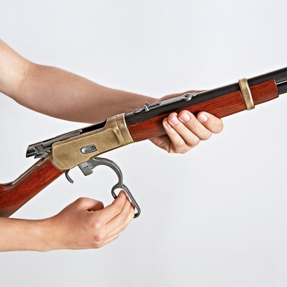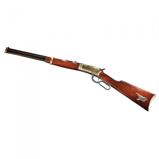 La "Winchester" est probablement la plus connue des armes du Far West – elle joua à partir de 1866 un rôle essentiel dans la conquête de l'ouest et ce fut également la "star" de nombreux films de cinéma. Le modèle WINCHESTER 1876, conçu à l'origine pour la chasse au gros gibier, fut plus tard utilisé par la police canadienne à cheval. Cette imitation est fabriquée en métal avec des pièces en bois. Dispositif de mise à feu et mécanisme de réarmement fonctionnent (le modèle-réduit ne peut cependant pas tirer) ! Dim. (L x l x h) : env. 98 x 4 x 11 cm. Vous aimez les objets de l'époque du Far West ? Alors cet exemplaire est exactement ce qu'il vous faut !