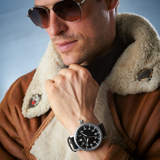 Volledig identiek aan het legendarische pilotenhorloge „Baumuster A“ van 1940