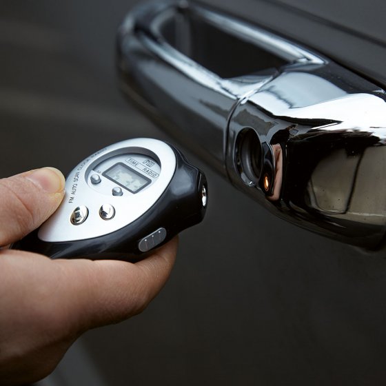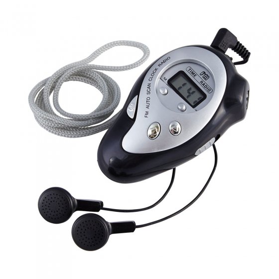 In borstzakformaat: aangenaam lichte FM-radio met horloge, lcd-display met grote cijfers en krachtige led. Met zenderzoekfunctie en koptelefoon van stereokwaliteit met regelbaar volume en draagriem. Afmetingen: ca. 8 x 5 x 3 cm. Vervaardigd van schokbestendige kunststof. Werkt op 2 AAA-batterijen (apart verkrijgbaar).