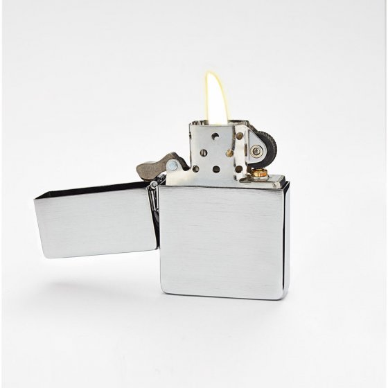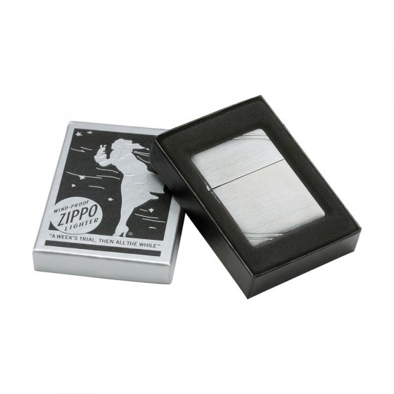 Zippo-aanstekers zijn cult. De oorspronkelijke vorm en verpakking van de eerst ontwikkelde stormaansteker-serie uit 1933 zijn dan ook zeer gewild bij verzamelaars. U kunt nu een replica van de hoekige ZIPPO-AANSTEKER 1935 met uitwendig scharnier bemachtigen (vanaf 1942 is de behuizing iets ronder geworden en de scharnieren zitten er nu in)! Zoals alle Zippo-aanstekers werkt dit model op benzine en is altijd betrouwbaar, zelfs bij weer en wind. Het oppervlak is van geborsteld chroom. Aan de onderkant van de aansteker zit een Zippo-stempel met productiemaand en -jaar. Afm. (lxbxh): ca. 1,5 x 4 x 5,5 cm. De aansteker wordt uiteraard in de verpakking van toen geleverd, geheel in stijl met ’Miss Windy’!