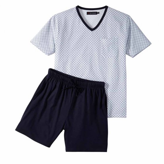Een ventilerende, luchtige ZOMERPYJAMA, ideaal voor warme nachten. De jerseykwaliteit van 100% natuurlijk katoen neemt vocht op en geeft het af aan de omgeving. De broek heeft een elastische tailleband en is met een koord naar wens aan te passen. Voorzien van 2 steekzakken. Ook het dessin is aantrekkelijk: de V-hals scoort met een contrastbeleg en de borstzak met een subtiel borduursel. Gemakkelijk in de wasmachine te wassen. Gewoonweg perfect.