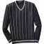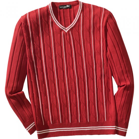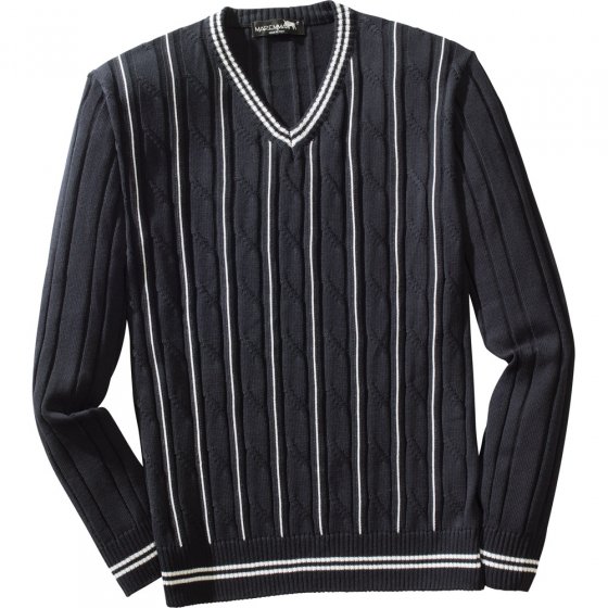 Truien als deze droegen heren voor het eerst rond 1920 bij het tennis, cricket of golf. Vandaag de dag draagt u deze ZOMERTRUI 'WIMBLEDON' in uw vrije tijd, tijdens het uitgaan en op reis. De hoogwaardige ribbreikwaliteit van 50% katoen, 50% polyacryl is zacht, prettig warm en ademend. Bovendien is de trui enorm vormvast en machinewasbaar. Een luxueus kabelmotief voor en contraststrepen accentueren de sportieve uitstraling. De verwerking met V-hals en een blijvend elastische ribboord aan de mouwen en onderlangs is zeer verzorgd. Game, set, match, voor deze tijdloos-mooie klassieker!